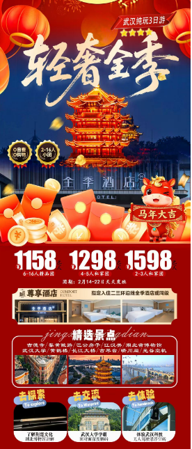 武汉纯玩3日游¥团期:2.18-2.23 488元/人起 - 〉